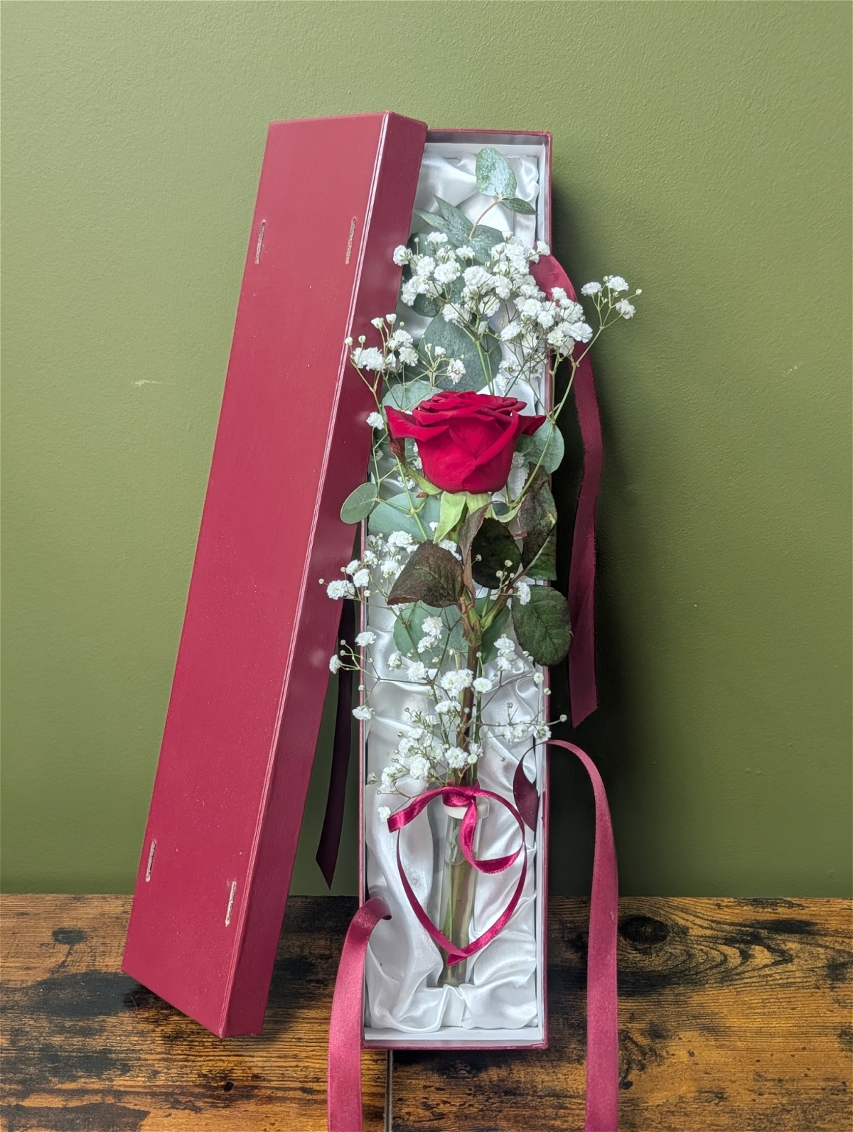 A single red rose with gypsophila and foliage presented in a burgandy gift box tied with burgandy ribbon.